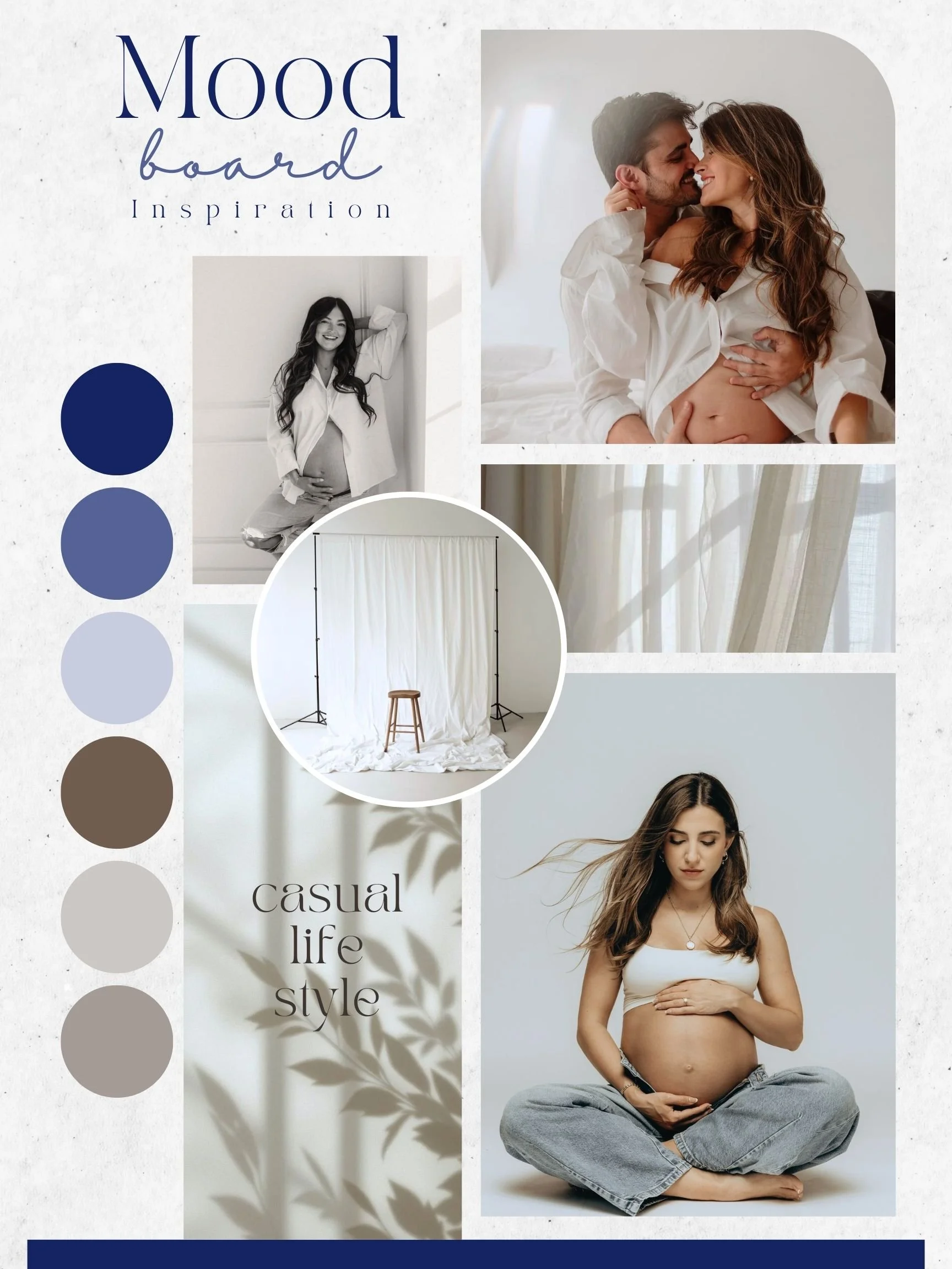 Our first look will be a casual life style set. We will utilize our white seamless backdrop as will as our new backdrop wall. This set will look gorgeous with our natural light and large windows. Our model will be styled with boyfriend jeans and an oversized button up, we will also have a high neck crop top to show off that perfect belly bump!